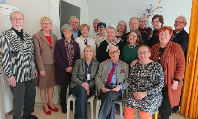 Kotkan vierailulla keväällä 2023 senioriystävät juhlivat 95 vuotta täyttävää Väinöä Sinervoa. Kuva: Nuoperi.
